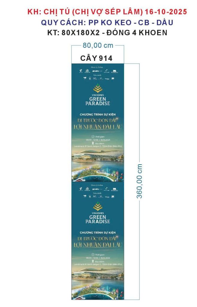 Standee PP không keo 360x80cm là giải pháp in ấn quảng cáo tiện lợi và chuyên nghiệp cho mọi nhu cầu trưng bày. Sản phẩm được in bằng mực dầu chất lượng cao, vì vậy màu sắc rõ nét, bền màu và chống phai tốt ngay cả trong điều kiện ngoài trời.
